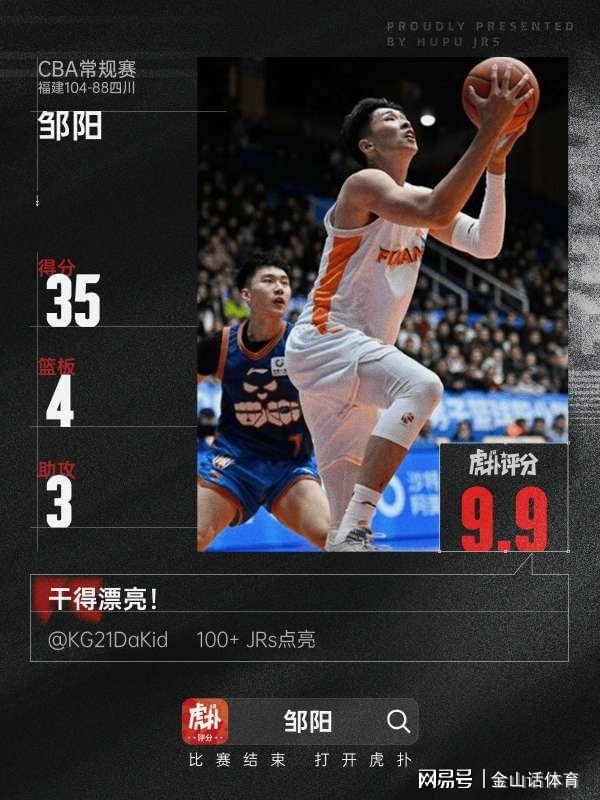 看看邹阳的表现,本场比赛,邹阳首发出战33分钟,17投13中,三分球9投7中,砍下35分3篮板4助攻,场上正负值为+22。